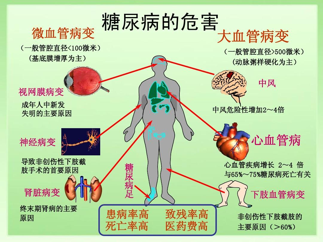 二是因长期慢性高血糖导致的慢性并发症,包括大血管和微血管病变。