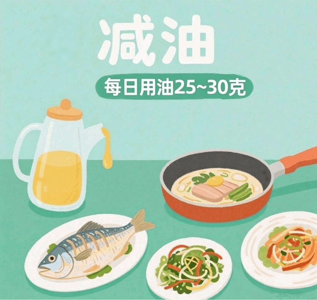 高脂肪、高胆固醇膳食是高脂血症和肥胖的危险因素。烹饪时尽量使用植物油,减少动物油的摄入。每天烹调油别超25-30g(约2-3汤匙 )!