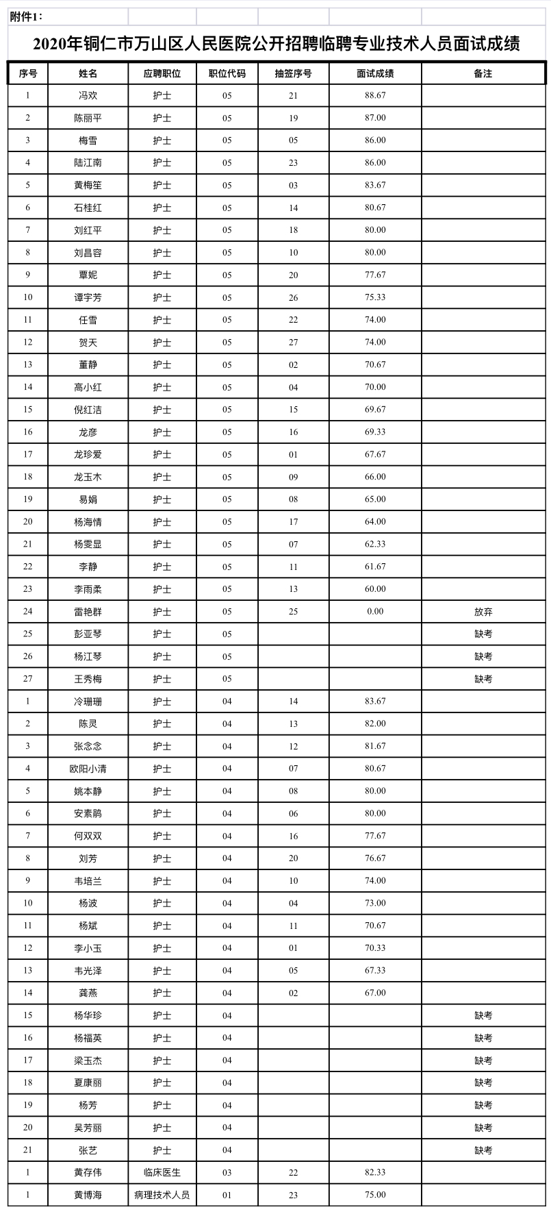 附件1:《2020年铜仁市万山区人民医院公开招聘临聘专业技术人员面试成绩》